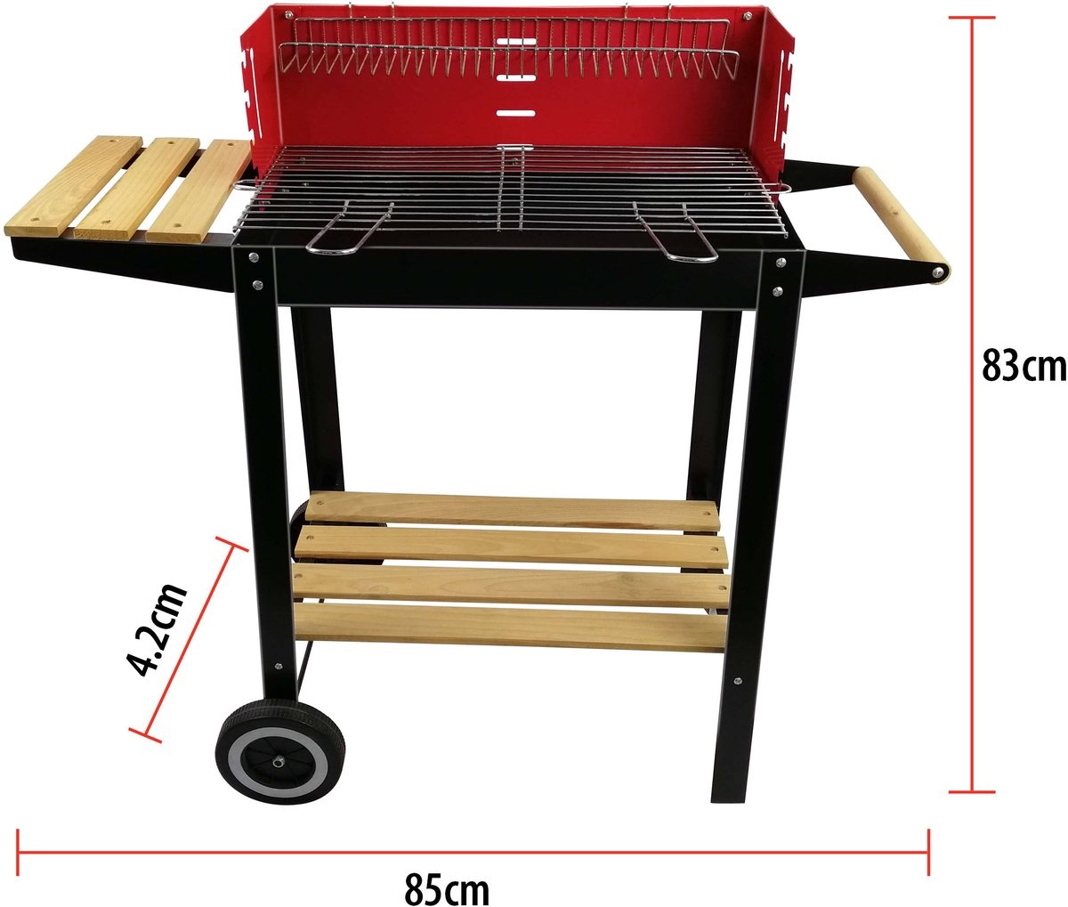 BBQ Collection - Holzkohlegrill - Räder - Verstellbarer Rost - Windschutzscheibe - Beistelltisch - Schwarz - Rot