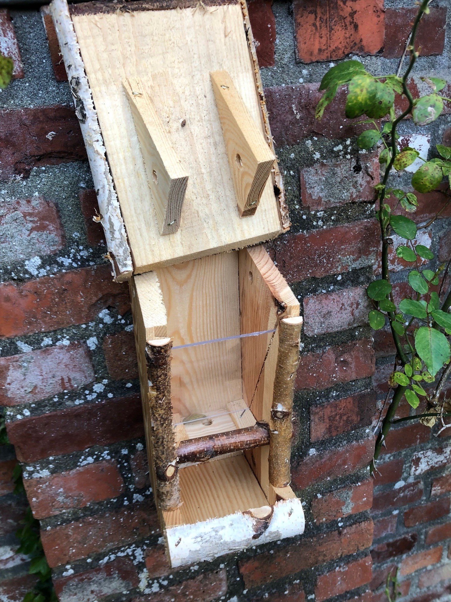 Mangeoire à oiseaux Dutchlander - montage mural - bouleau avec toit en brindilles & ; épingle à boule de graisse - 19x19x9 cm