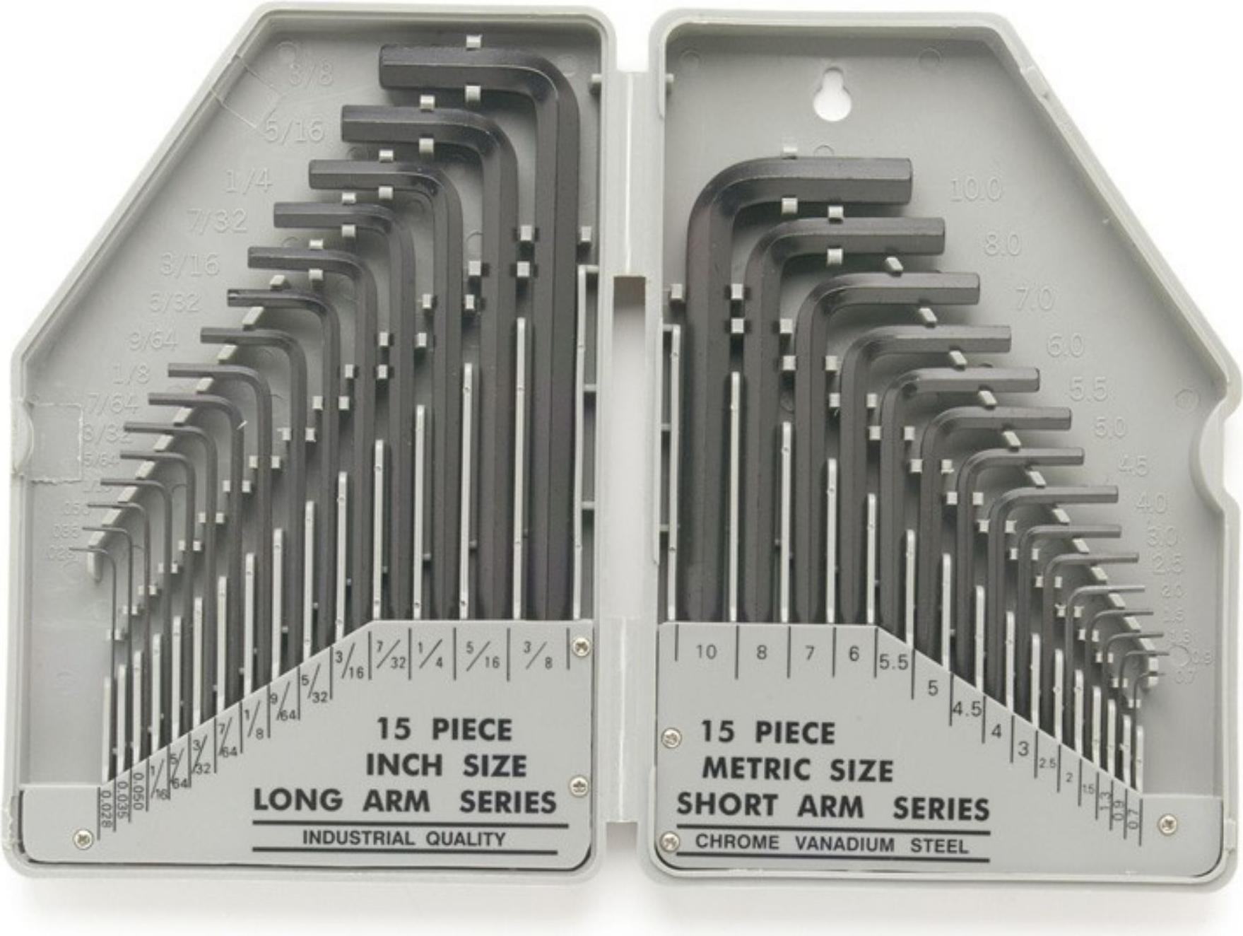 •15 clés SAE longues de 0,028 à 3/8" et 15 clés métriques de 0,7 à 10 mm, ce qui en fait un ensemble complet avec les tailles les plus courantes. Cela signifie que vous êtes toujours bien équipé pendant le travail.