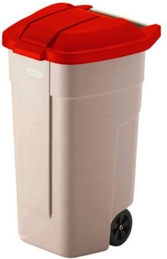 Poubelle solide Rubbermaid avec couvercle rouge et roulettes.