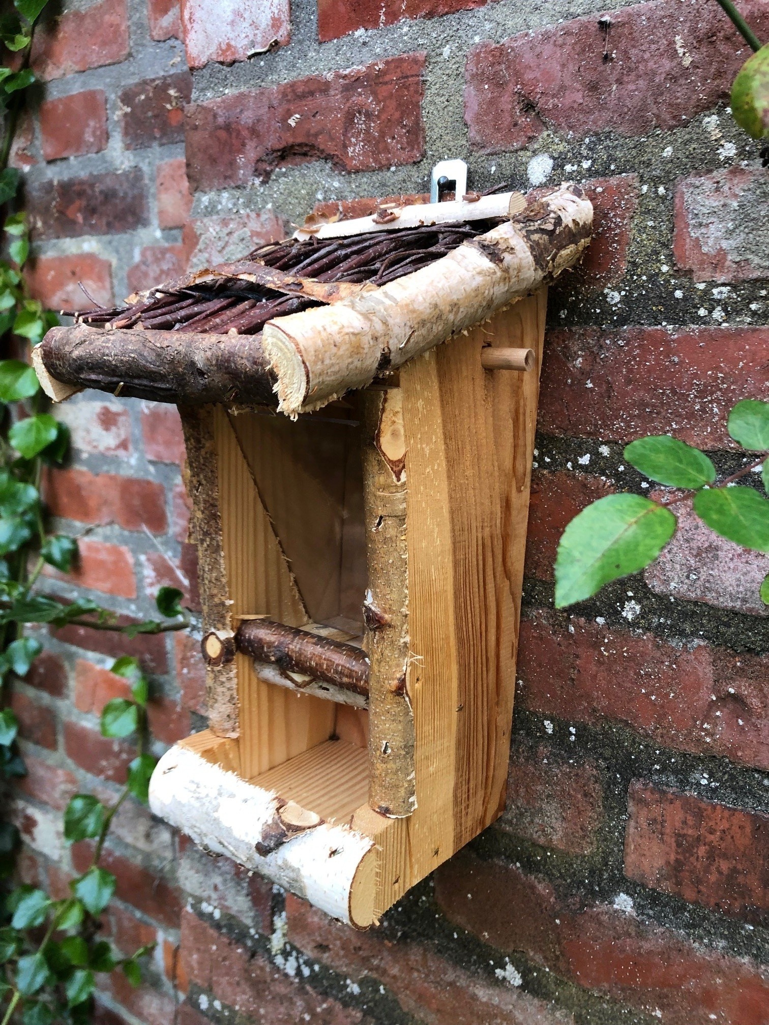 Dutchlander - Vogelvoedersilo – Muurbevestiging – Berkenhout met Wilgen Dak – Plexiglas Venster – 15x19x30 cmLees meer