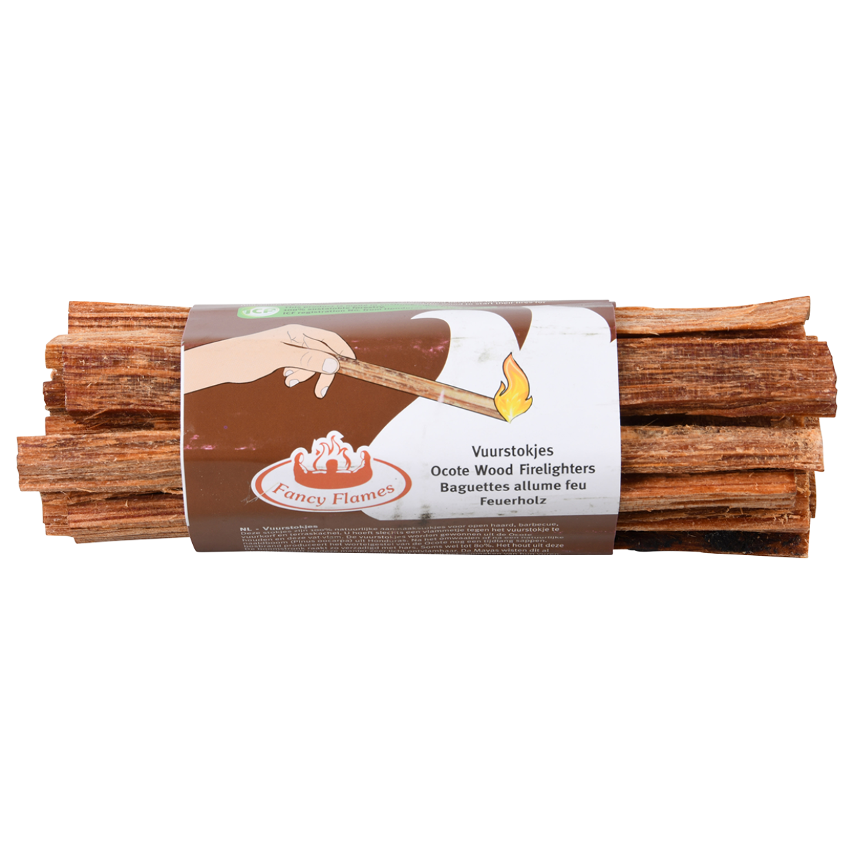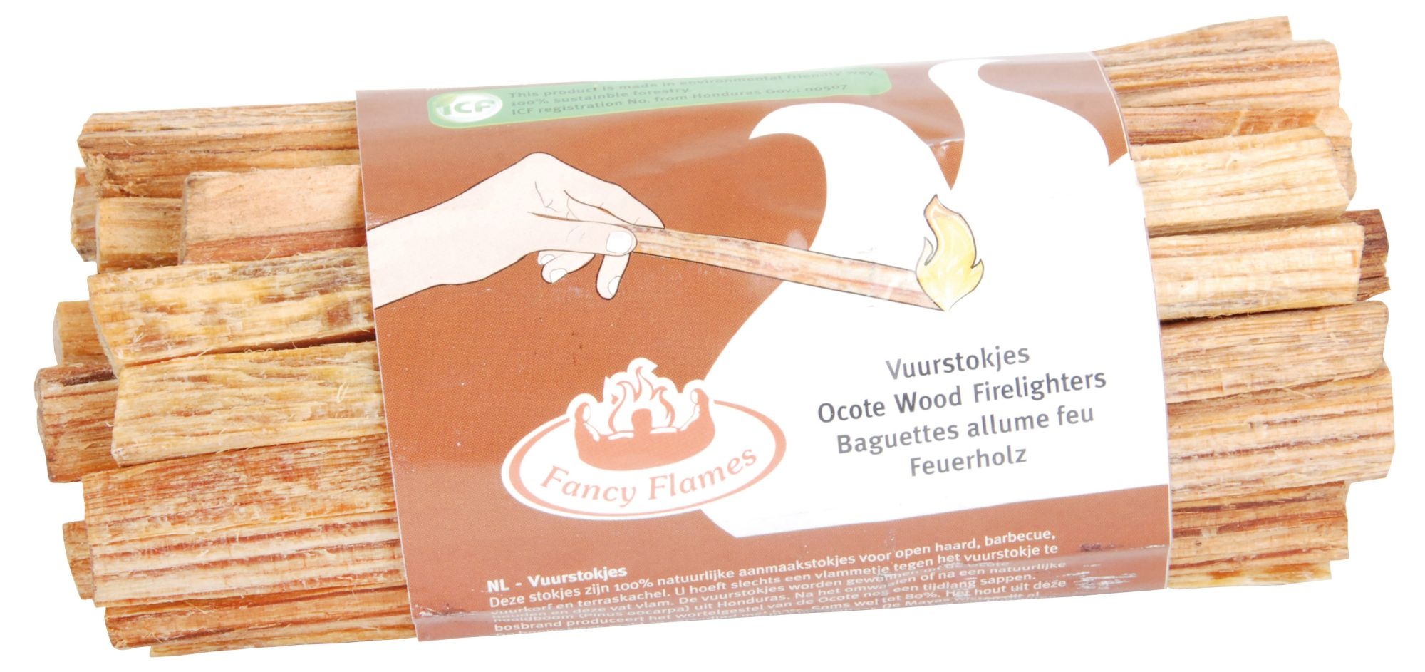 Herkomst: de vuurstokjes/fatwood worden gewonnen uit de Ocote naaldboom (Pinus Oocarpa) uit Guatemala. Na het omwaaien of na een natuurlijke bosbrand produceert het wortelgestel van de Ocote nog een tijdlang sappen. De boomstronk raakt zo verzadigd met hars. Soms wel tot 80%. Het hout uit deze stronken wordt op deze manier zeer licht ontvlambaar. De Mayas wisten dit al duizenden jaren geleden en gebruikten dit hout bij het aanmaken van hun vuren.