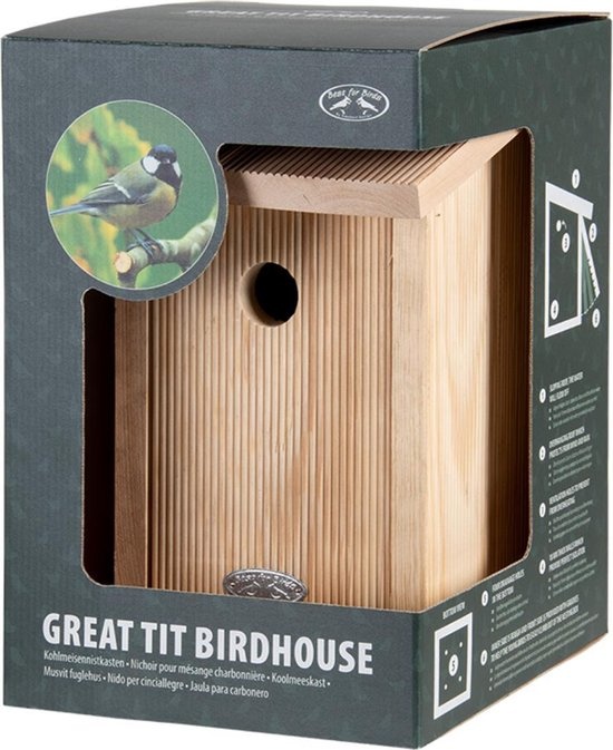 Deze nestkast is speciaal ontworpen voor de koolmees, maar veel andere grotere meesachtigen zullen ook gebruik maken van deze nestkast. Aan de voorzijde zit een invliegopening van circa 32 mm. Aan de voorkant van het huisje zit een klepje. Deze kan geopend worden om het vogelhuisje schoon te maken. Aan de achterzijde zit een ophangoog, waarmee de nestkast gemakkelijk opgehangen kan worden.