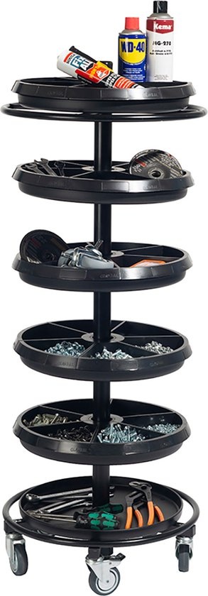 Mobiele Efficiëntie: De Roundabout is ontworpen voor jouw mobiliteit en efficiëntie. Of je nu door een magazijn of werkplaats manoeuvreert of bezig bent met het verzamelen van verschillende items, deze rijdende opslagoplossing is altijd aan jouw zijde.