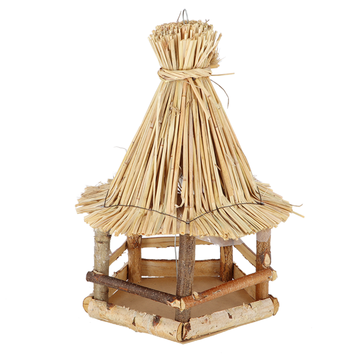 Hangend vogelvoederhuis berkenhout met dak van stro