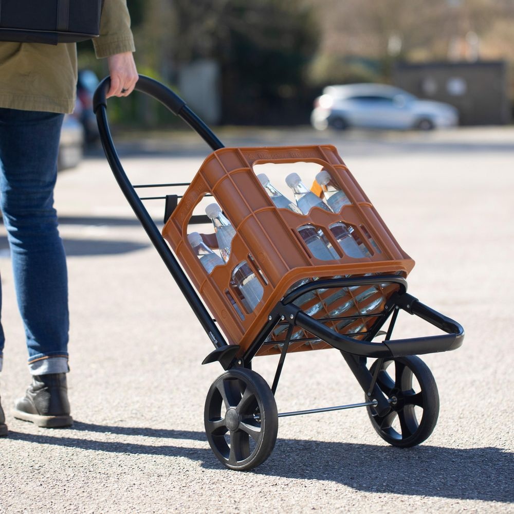 Het frame kan bovendien worden gebruikt als lichte steekwagen voor bijvoorbeeld kleine drankkratten of andere lasten tot 20 kg. De soepel rollende wielen met spritzschutz zorgen voor comfort en stabiliteit, ook op ongelijke ondergrond. Na gebruik klap je de trolley eenvoudig in en berg je hem compact op.