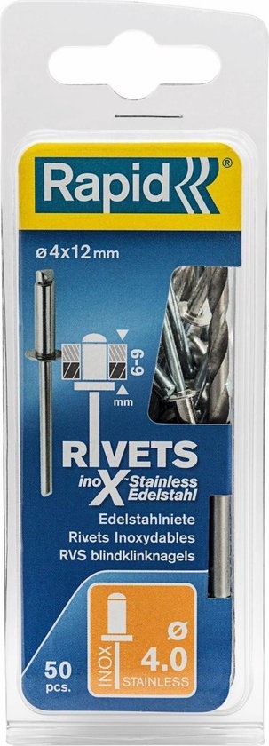 Blindklinknagels rvs 4 x 12 mm, 50 stuks inclusief boor. Rvs (kop) /staal (trekpen) blindklinknagel. Toepassingen: vochtige omgeving en buitengebruik voor reparatie en permanent bevestigen van metaal en kunststof. Geschikt voor Voor Rapid RP40, RP100. Verpakt in een blister.